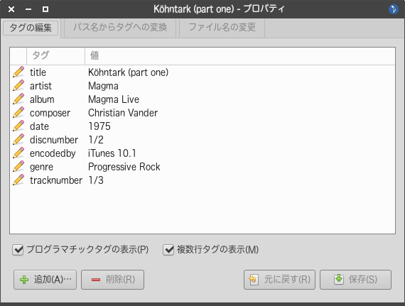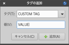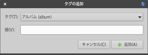 で、起動してみたのですが、Ex Falso/Quod Libet では、MP3 ファイルでは任意のタグ名を入れられるのですが、M4A ファイルを開くとタグ名はプルダウンメニューで決まったものしか選べません。タグの編集は Quod Libet でもできるのですが、機能は当然同じです。